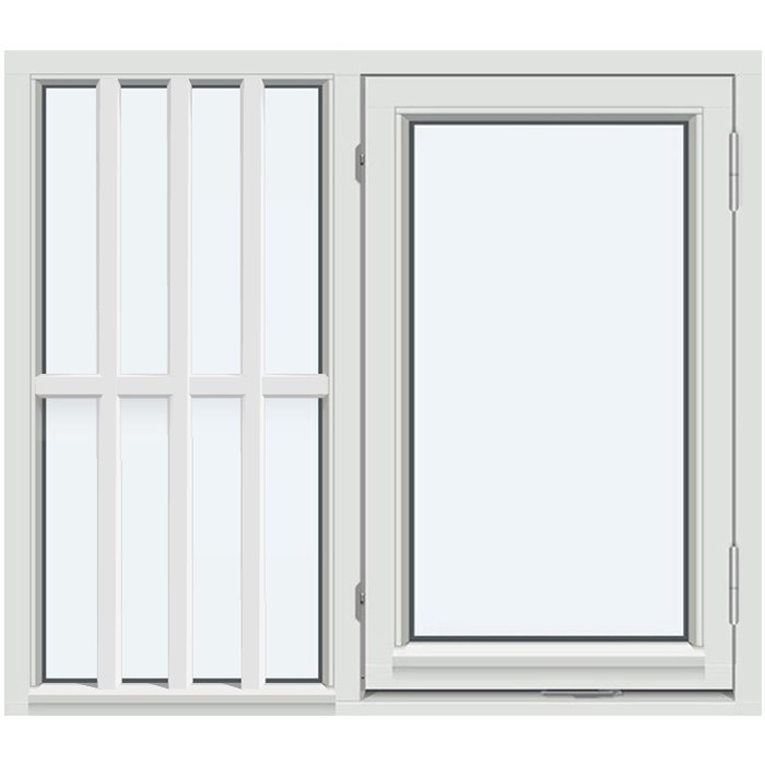 Dette kombinasjonsvinduet Sidehengslet/Fastkarm 1:1 med 1 vannrett og 3 loddrette sprosser er et trygt valg både ved nybygg og rehabilitering. Den sidehengslede åpningsdelen gir fleksibel lufting og enkel rengjøring, mens fastkarmen gir et fast felt som slipper inn mye naturlig lys. Ruteinndelingen med fire felt gir vinduet et diskret, men markert uttrykk som fungerer like godt på tradisjonelle trehus som på nyere boliger og hytter.
