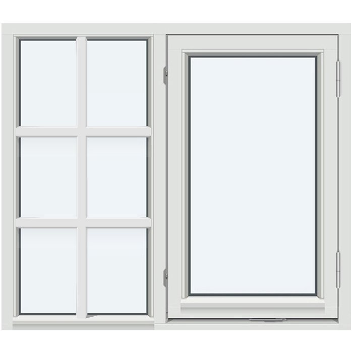 Dette kombinasjonsvinduet med sidehengslet felt og fastkarm i 1:1-1:1 inndeling er et godt valg når du vil kombinere funksjonelle løsninger med et mer spennende vindusdesign. Fastkarmdelen gir et lyst og stabilt glassfelt, mens den sidehengslede rammen sørger for praktisk ventilasjon og enkel rengjøring. Vinduet leveres i slitesterkt treverk tilpasset norsk klima, med mulighet for utvendig aluminiumskledning og energieffektivt isolerglass.