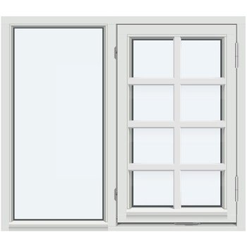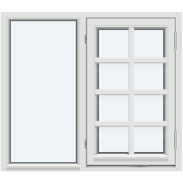 Dette kombinasjonsvinduet med sidehengslet felt og fastkarm i 1:1-1:1 inndeling er perfekt når du vil kombinere stort lysinnslipp med et mer særpreget sprossedesign. Fastkarmdelen gir et lyst og stabilt glassfelt, mens den sidehengslede rammen sørger for praktisk ventilasjon og enkel rengjøring innenfra. Vinduet leveres i kvalitetstre tilpasset norsk klima, med mulighet for utvendig aluminiumskledning og energieffektivt isolerglass.