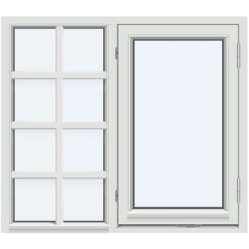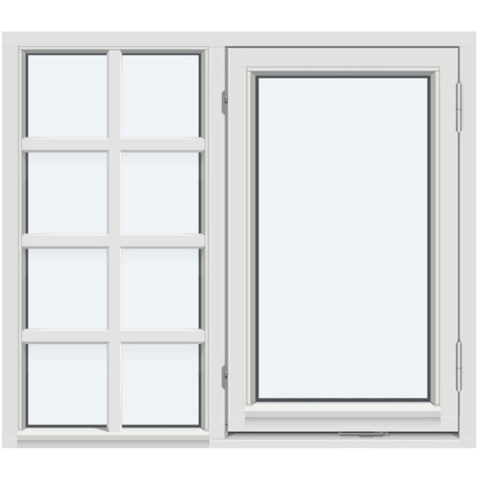Dette sidehengslede / fastkarm kombinasjonsvinduet i 1:1-1:1 inndeling gir en god balanse mellom funksjon, komfort og markert ruteinndeling. Det faste feltet slipper inn mye dagslys og gir godt utsyn, mens den sidehengslede rammen gir enkel lufting og trygg bruk i hverdagen. Vinduet produseres i solid treverk med mulighet for utvendig aluminiumskledning, samt moderne isolerglass med lave U-verdier.